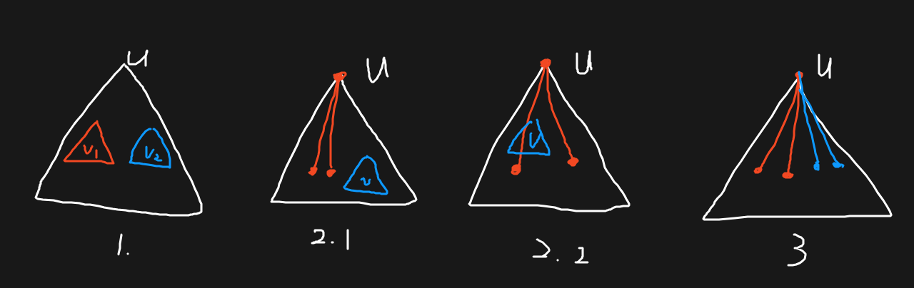 - 这一条两支都来自 v 子树:有重合,不可能发生。