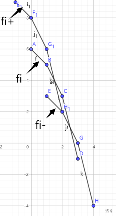 - 显然对于『凸出来』的点(即图中除了 \(E,H\) 以外的点),能切到的直线斜率为一个范围;而位于直线上的点(途中 \(E,H\)),能切到的直线斜率更是定死了。所以这要求你的二分精度需要略高一点。